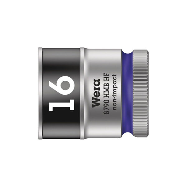 05003750001 Wera 8790 HMB HF 3/8” Zyklop Socket w/ Holding Function. Tip Size: 16.0mm Total Length: 29.0mm External Dimension: 24.2mm Diameter Rear: 23.5mm Tip Height: 12.5mm