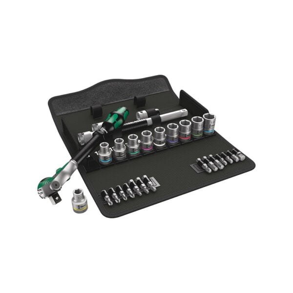 The 05004076001 Wera 28PC 8100 SC 6 1/2” Zyklop Metric Speed Ratchet Set is an incredibly compact set arrangement with many tools in a minimum of space. A completely new ratchet set feeling thanks to the unique textile boxes that are very robust and durable. They can be positioned upright for tidy storage on the workshop shelf.