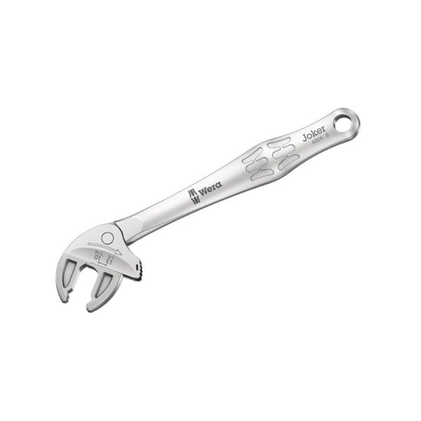 05020100001 Wera 6004 Joker S Self-Setting Spanner Wrench gives many users the wish to have a universal screwdriving tool with the widest possible range of applications. It should be a single tool for multiple metric and imperial dimensions. It should automatically adjust to the different screw sizes. It should be safe to grab without damaging anything and allow for a high working speed. The continuous and parallel jaws replace several single spanner dimensions. The required size is automatically and continuously set when attaching the tool to the hexagon bolt or screw. The integrated lever mechanism securely clamps the hexagon screw or bolt between the jaws, which significantly reduces the risk of slipping or damage. The ratchet function ensures fast and consistent screwdriving without removing the tool. Thanks to the corner-width rectangular prisms, a return angle of only 30° can be realized. The single-arm design in conjunction with the ratchet function and the corner-width prism make it possible to work even in confined spaces. The adjustable Wera 6004 Joker S Self-Setting Spanner Wrench is the universal screwdriving tool. Self-setting. Gripping. Spanning.
