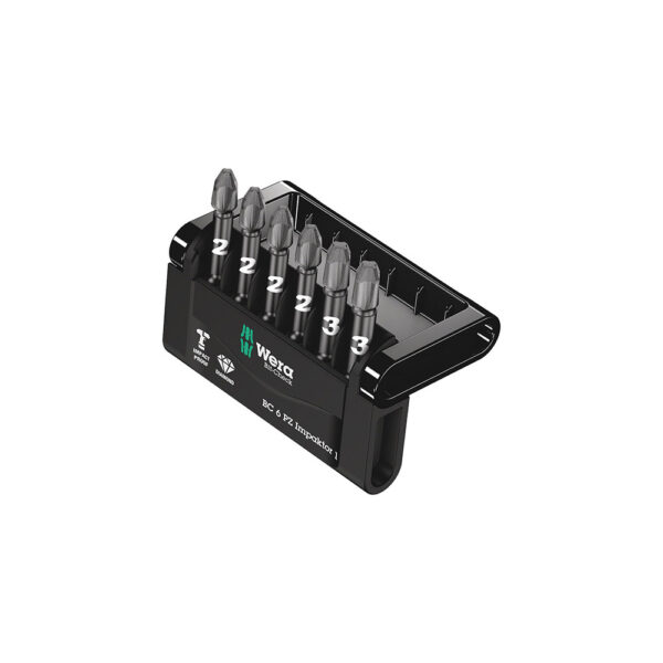 The 05057692001 Wera 6 Pc. Pozidriv Impaktor 1 Bit-Check consists of 6 Wera Impaktor bits tidily arranged in a minimum of space in a practical Bit-Check. The Impaktor technology offers an above-average service life even under extreme circumstances thanks to the best possible utilisation of the material properties and the optimised geometry.