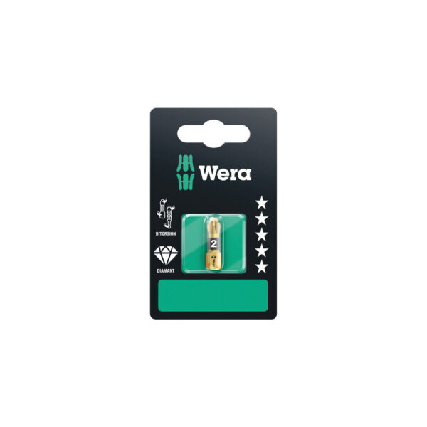 05073338001 Wera 855/1 BDC 1/4” Hex Pozidriv ® Insert Bits are high quality bits designed for pozidriv screws. Wera 855/1 BDC 1/4” Hex Pozidriv ® Insert Bits feature tiny diamond particles on the bit tip, which ensures a secure fit of the bit in the screw reducing the contact pressure required and lowers the risk of slipping.