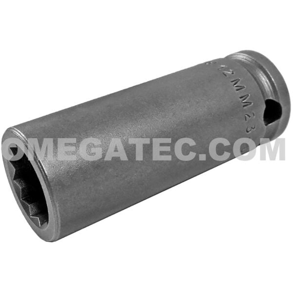 12MM23 Apex® Brand 12mm 6-Point Long Impact Impact Socket, 3/8” Square Drive. Socket Type: 6-Point Hex Opening: 12mm Overall Length: 50.8mm Nose End Diameter: 19.1mm Drive End Diameter: 19.1mm Opening Depth: 7.2mm