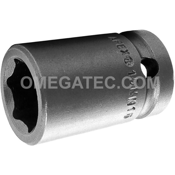 15MM15 Apex® Brand 15mm 6-Point Metric Standard Impact Socket, 1/2” Square Drive. Socket Type: 6-Point Hex Opening: 15mm Overall Length: 38.1mm Nose End Diameter: 23.8mm Drive End Diameter: 23.8mm Opening Depth: 11.1mm