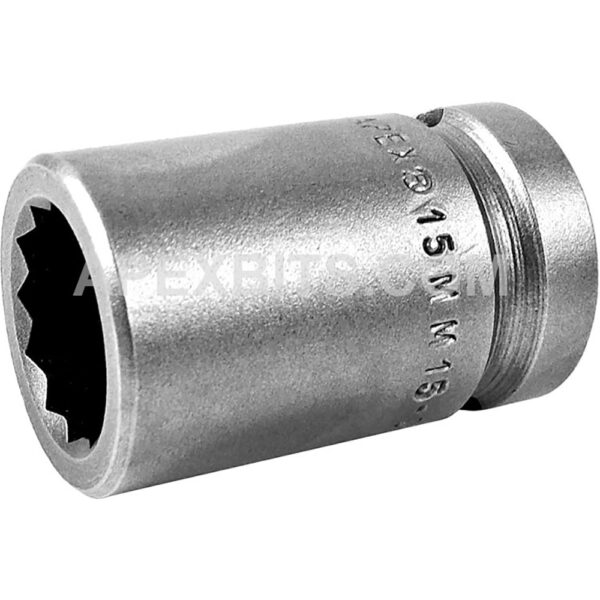 15MM15-D Apex® Brand 15mm 12-Point Metric Standard Impact Socket, 1/2” Square Drive. Socket Type: 12-Point Hex Opening: 15mm Overall Length: 38.1mm Nose End Diameter: 23.8mm Drive End Diameter: 23.8mm Opening Depth: 11.1mm