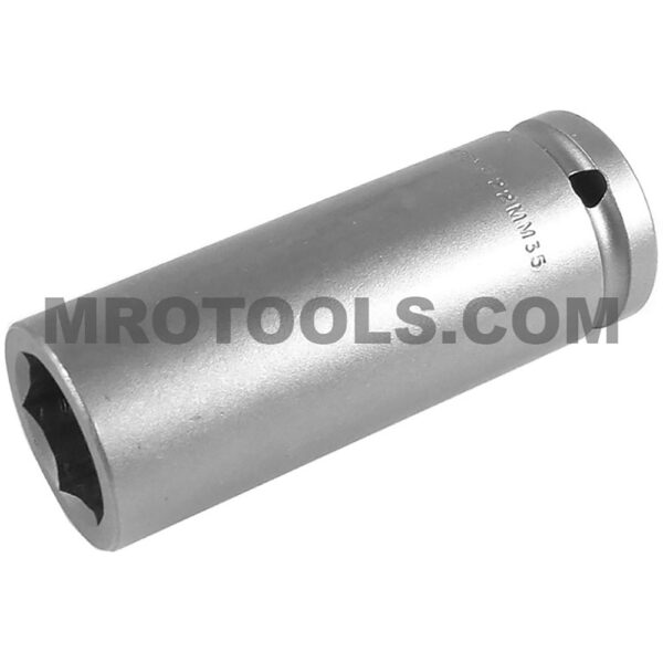 22MM35 Apex® Brand 22mm 6-Point Metric Extra Long Impact Socket, 1/2” Square Drive. Socket Type: 6-Point Hex Opening: 22mm Overall Length: 88.9mm Nose End Diameter: 33.3mm Drive End Diameter: 33.3mm Opening Depth: 14.3mm