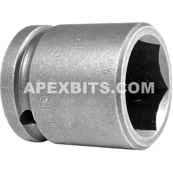 24MM15 Apex® Brand 24mm 6-Point Metric Standard Impact Socket, 1/2” Square Drive. Socket Type: 6-Point Hex Opening: 24mm Overall Length: 38.1mm Nose End Diameter: 34.9mm Drive End Diameter: 34.9mm Opening Depth: 15.9mm