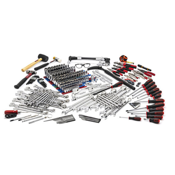 In addition to essential tools like screwdrivers, pliers, punches, chisels, and hex keys, the set also includes specialty items such as Torx® bit sockets, automotive-specific tools like low-voltage circuit testers, feeler gauges, gasket scrapers, inspection tools, wire strippers/crimpers, and more.