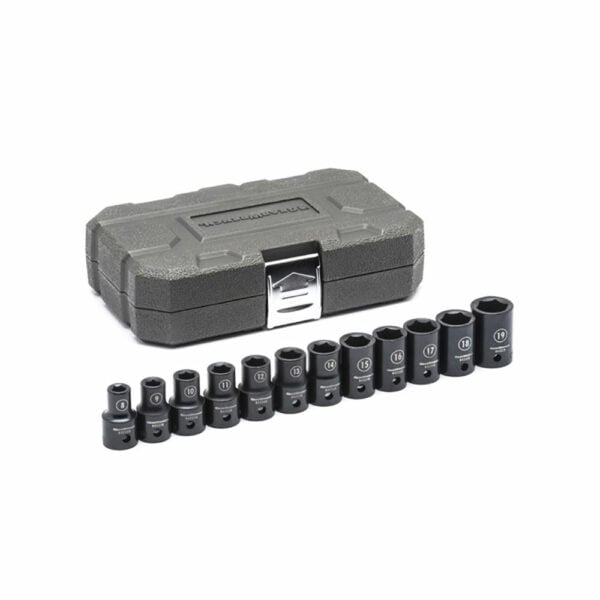 The 84930N GearWrench 12pc 1/2” Drive 6 Point Standard Impact Metric Socket Set is made of chrome molybdenum alloy steel (Cr-Mo) for exceptional strength and durability with a black oxide finish to resist corrosion and an off-corner loading design reduces fastener rounding.