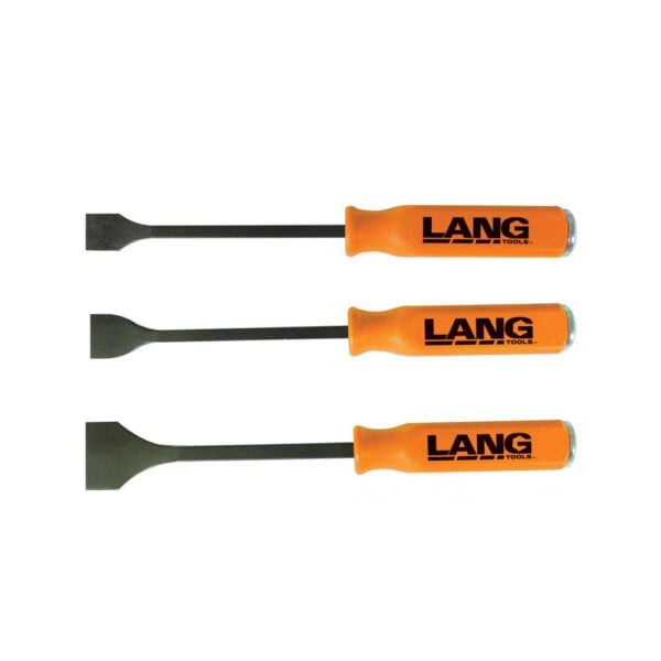 Lang 3 Piece Gasket Scraper Set includes 3/4” Face, 1” Face, 1-1/2” Face. Forged from high carbon steel, bit extends handle length to strike cap, blade face and scrape ends are precision ground, designed for comfort secure grip and durability.
