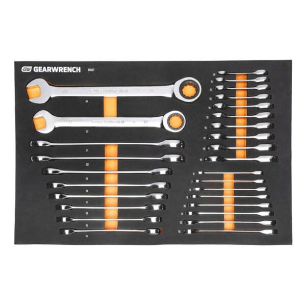 Organization and durability are key aspects of the 86527 GearWrench 28PC 72-Tooth 12 Point Metric Standard & Stubby Combination Ratcheting Wrench Modular Set, which includes a premium precut foam storage tray, ensuring each tool has a designated spot for peak organization. The tray, with dimensions of 20.25” x 13.5” x 2.0”, fits neatly into most workbenches and tool chests, keeping your workspace tidy and your tools readily accessible. Meeting or exceeding ASME and ANSI specifications, the 86527 GearWrench 28PC 72-Tooth 12 Point Metric Standard & Stubby Combination Ratcheting Wrench Modular Set comes with a lifetime warranty, underscoring the manufacturer’s confidence in the quality and durability of these tools. Whether tackling automotive repairs, machinery maintenance, or home improvement projects, the 86527 GearWrench 28PC 72-Tooth 12 Point Metric Standard & Stubby Combination Ratcheting Wrench Modular Set is built to deliver performance and reliability.