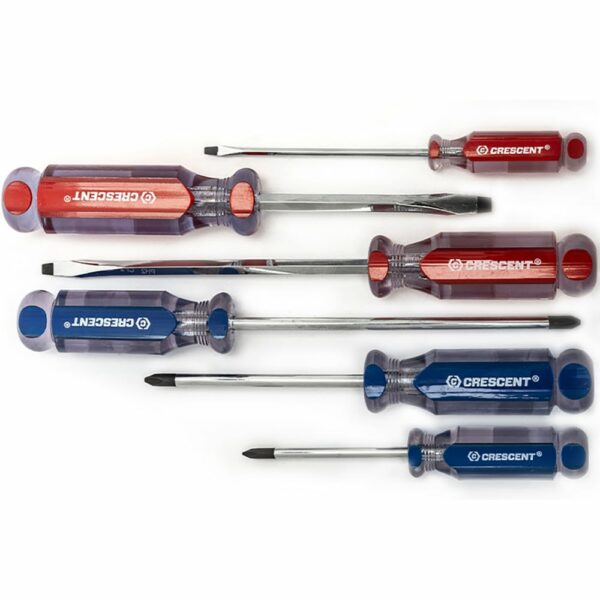 Crescent CPS6PCSET Phillips/Slotted Acetate Screwdriver 6PC Set. Insulated : No ASME Specification : B107.600-2008 Blade Type : Solid Shaft Handle Color : Blue Red Handle Material : Acetate Tip Finish : Black Oxide