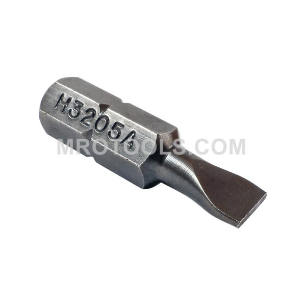 H3205A Zephyr 1/4” slotted hex shank insert bit. These slotted screwdriver bits are aircraft or machine screw bits, with intermediate hardness. Screw Size: 5F-6R Blade Thickness: .036” Blade Width: .219” overall length: 1”