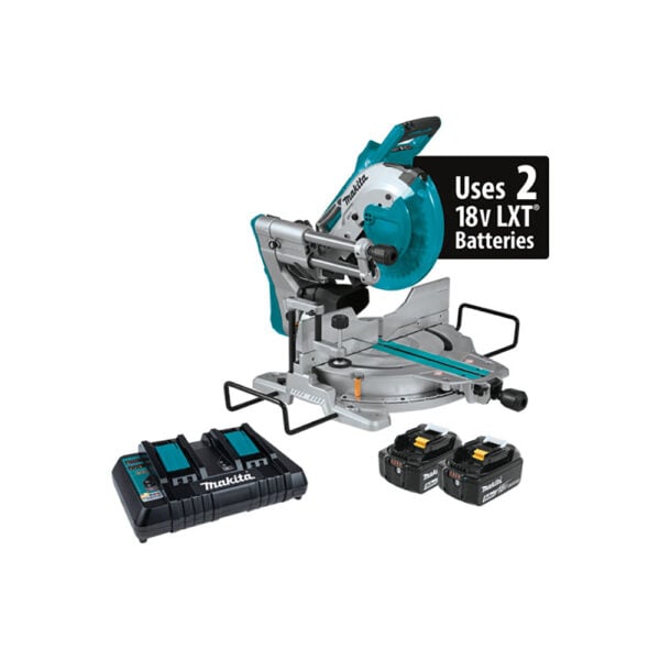 The Makita XSL06PT 36V (18V X2) LXT Brushless 10” Dual-Bevel Sliding Compound Miter Saw with Laser Kit (5.0Ah) can be powered by Makita 18V LXT® and Compact Lithium-Ion batteries with the star symbol, offering flexibility and convenience. It comes with a dual-port rapid optimum charger that actively manages current, voltage, and temperature to optimize battery life. The charger also features a built-in fan for faster and more efficient charging.