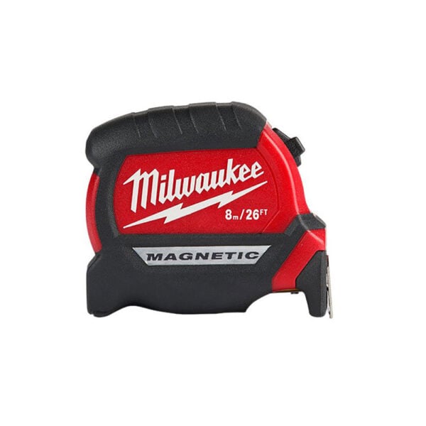 Milwaukee 48-22-0326 Compact Wide Blade Magnetic Tape Measures 8m/26ft Our Milwaukee 48-22-0326 Compact Wide Blade Magnetic Tape Measures 8m/26ft have up to 15′ of reach allowing you to quickly take measurements. The tape is wear and impact-resistant with nylon blade protection and an additional anti-tear coating on the first 6 of the blade, reducing tape tear. Built to withstand the jobsite, the compact measuring tapes are constructed with a 5-point reinforced frame for impact resistance.