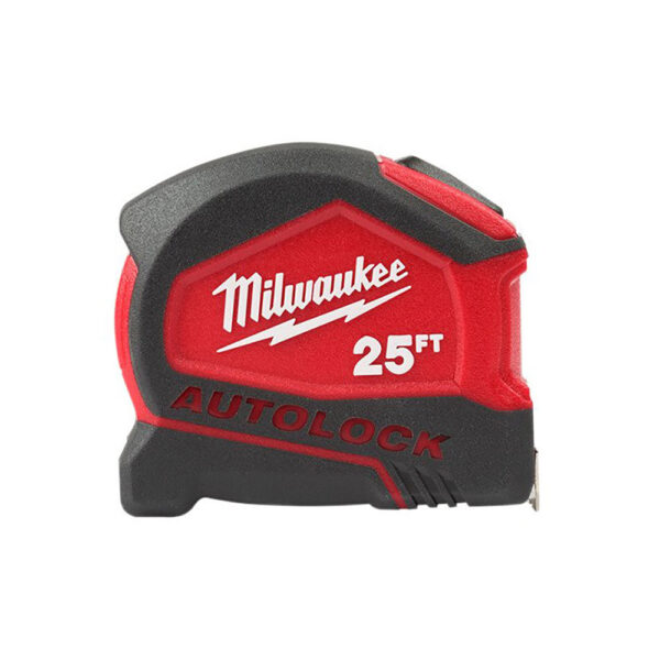 Milwaukee 48-22-6825 Compact Auto-Lock Tape Measures 25ft Our Milwaukee 48-22-6825 Compact Auto-Lock Tape Measures 25ft have up to 12′ of reach. The auto-lock design automatically locks your blade in place for quick and efficient measuring. Equipped with wear resistant nylon blade protection and an impact-resistant 5-point reinforced frame, these tapes withstand the jobsite.