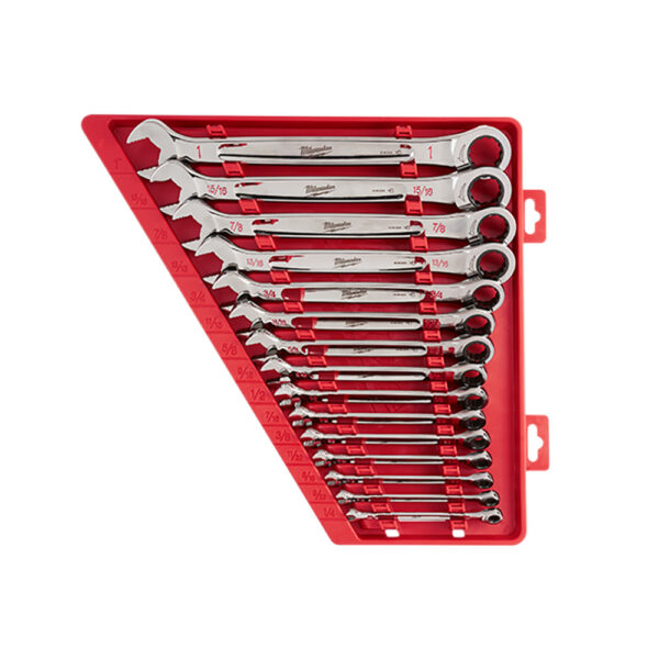 Our ratcheting combination wrench set features ink-filled size labels for easy size identification, as well as quick distinction between SAE and metric sets. The Milwaukee 48-22-9416 SAE Ratcheting Combination Wrench 15PC Set comes in a tray designed for steel storage drawers, allowing for efficient storage with no wasted space.