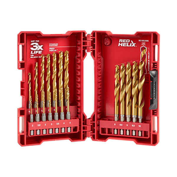 Milwaukee 48-89-4860 SHOCKWAVE RED HELIX Titanium Metric 19pc Set Milwaukee 48-89-4860 SHOCKWAVE RED HELIX Titanium Metric 19pc Set is engineered for impacts and drills. Designed with a Variable Helix with an aggressive 35 Helix Angle which ends at 15, the Milwaukee 48-89-4860 SHOCKWAVE RED HELIX Titanium Metric 19pc Set provides Rapid Chip Removal to limit heat buildup to Stay Sharper Longer.