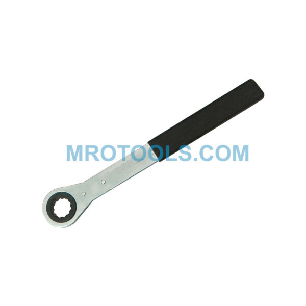 Lang flat ratcheting box wrench 12 point, large, metric. Socket Size: 23mm Point Size: 12 Width: 1 15/16” Thickness: 9/16” Overall Length: 12”