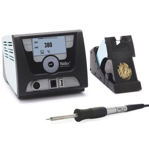 The robust touch screen is a capacitive touch panel made of real glass. It is antistatic and temperature-resistant while the turnand-click wheel with confirm button allows intuitive operation. The WX1011 features visual process control through LED signal function with a blue LED ring light (light is out = Off, light is blinking = standby or heating up, light is on = tip ready for use). Thanks to an integrated sensor, WX tools are motion activated, this means that they consume power only when they are actually in use, connected accessories also go into standby mode. The Weller WX1011 is ESD safe and features equipotential balance, unit data traceability, intelligent tool detection, and a USB interface.